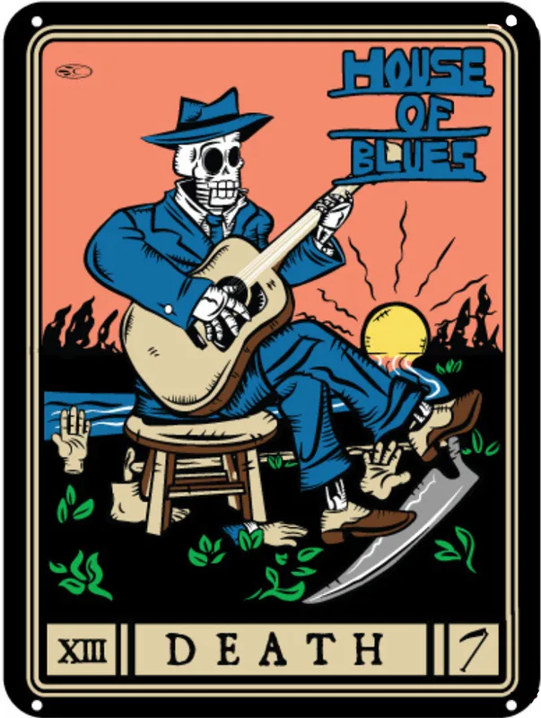 Legend has it that Robert Johnson sold his soul to the devil at a Mississippi crossroads, forever changing music. This sign captures that legendary deal, with a skeleton bluesman wailing on his guitar under a fiery sky. It’s a little piece of that mythic musical history, without the Faustian bargain.